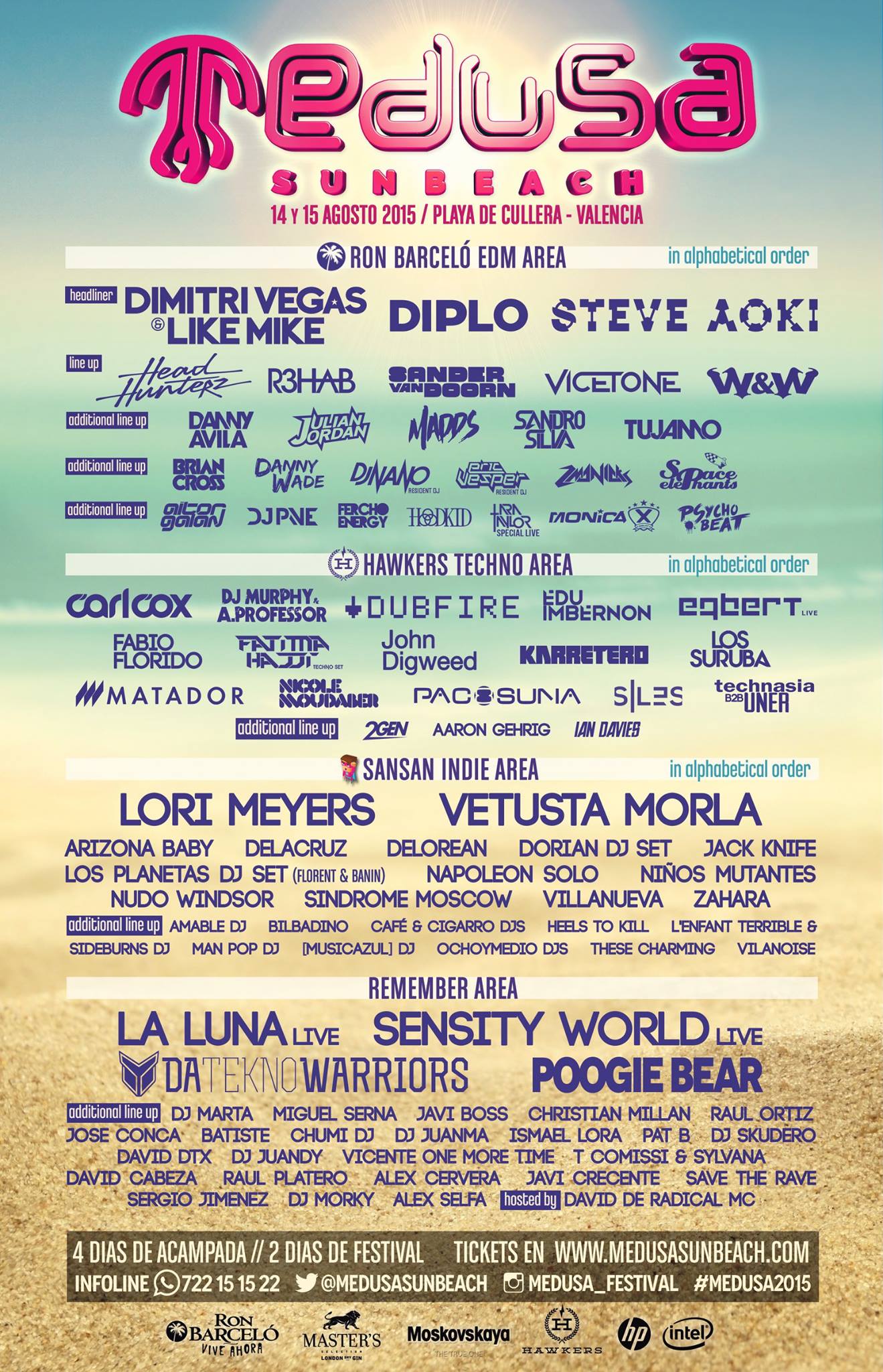En la Segunda Edición, El Medusa Sunbeach Festival albergó la actuación de archiconocidos artistas del género Mainstream como Dimitri Vegas & Like Mike, Diplo, Steve Aoki, W&W, R3hab, etc. Pero es que en Techno no se quedaron cortos, pudimos disfrutar del gran Carl Cox, de Dubfire, de talento nacional como Paco Osuna y Los Suruba. Para esta edición incorporaron también un escenario con estilo Indie, en el que contaron con las actuaciones de Vetusta Morla, Lori Meyers, Dj Sets de Dorian y Los Planetas, etc. Y para los amantes del género Remember, apostaron por artistas de renombre como Poogie Bear o el Live de Sensity World. En definitiva, en esta edición lograron posicionarse como uno de los festivales Top de la península, aunque aún iban a crecer mucho más.